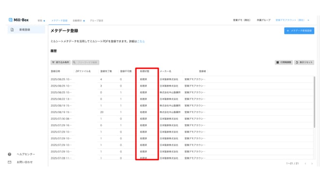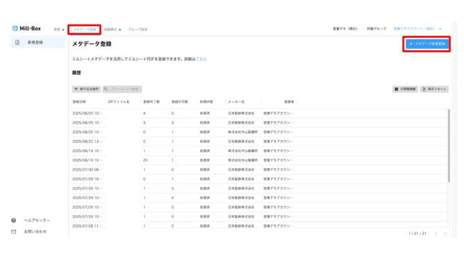 メーカーが公開しているメタデータをMill-Boxに登録することで、ミルシートの管理および需要家への開示に利用することが可能です。