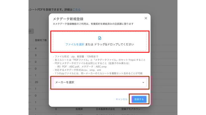 表示されたポップアップにて、ファイル選択もしくはドラックアンドドロップにてファイルを挿入し、アップロードしたいメタデータのメーカー名を選択の上、[登録する]を押してください。