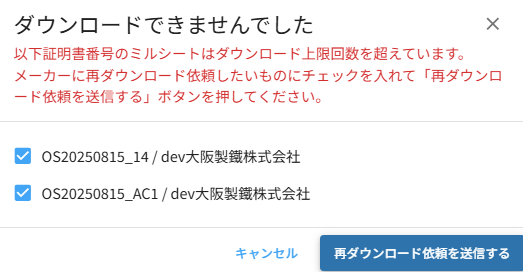 ダウンロード回数の上限を超えたミルシートの再ダウンロードするには、メーカーに再ダウンロード依頼をする必要があります。